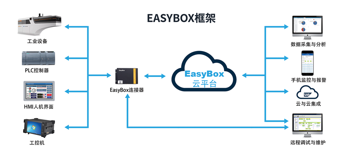 惠昌电通致力于打造工业设备的通信解决方案,将厂家需求的设备通过EasyBox接入互联网,利用先进的云技术实现大量设备入网通信、数据传输、云计算、远程运维等功能,降低了工厂的投入,也帮助企业尽快跨入工业互联网时代。